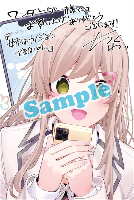 特典情報 2023.06.27 『妹はカノジョにできないのに(1)』特典情報 妹はカノジョにできないのに(1) 作画:ちくわ。 原作:鏡 遊 キャラクターデザイン:三九呂 試し読み シリーズ詳細 桜羽春太の妹・雪季は、モデル顔負けの美貌に、抜群のスタイル、おまけに性格も良い中学3年生。そしてなにより、お兄ちゃんが大好き!抱きついてきたり(!)、目の前で着替えたり(!?)、お風呂に入ってきたり(!!!?)も当たり前。他人から見れば普通じゃないかもしれないけれど、春太と雪季にとっては楽しく幸せないつもの日常……だったのだが?世界一可愛い妹との、幸せを追い求める兄妹ラブコメ第1巻! 発売日 2023年06月27日 定価 737円(本体670円+税) サイズ B6判 購入はこちら もっと見る 特典情報 アニメイト ミニ色紙 ゲーマーズ 4Pリーフレット メロンブックス イラストカード とらのあな イラストカード WonderGOO ポストカード まんが王 イラストカード 関連書籍 妹はカノジョにできないのに(1) 作画:ちくわ。 原作:鏡 遊 キャラクターデザイン:三九呂 発売日 2023年06月27日 定価 737円(本体670円+税) サイズ B6判 試し読み 詳細を見る